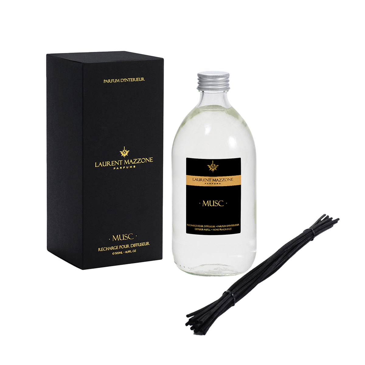 Recharge pour le diffuseur Musc, accompagnée de 12 bâtonnets en rotin.